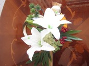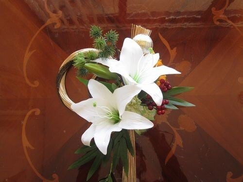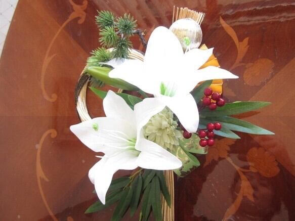 黒金の水引に大輪百合とマム、松、南天、笹の葉、和リボン、ピックで豪華でシンプルなしめ縄飾りをお作りしました。