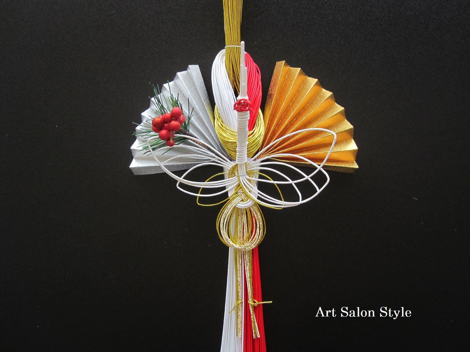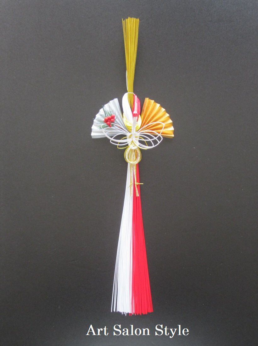 紅白の水引に扇、松、南天、鶴を飾り付け、新年を祝うシンプルなお正月飾りを作りしました。