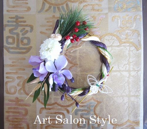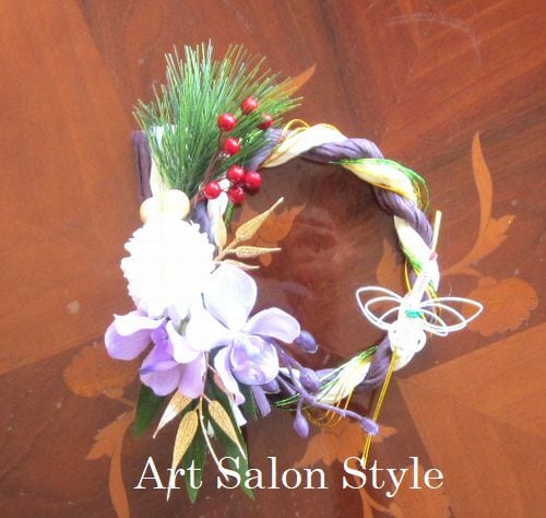 紫白のしめ縄にマム、蘭、鶴、松、南天等でアレンジをして、新年を祝うお正月飾りを作りしました。