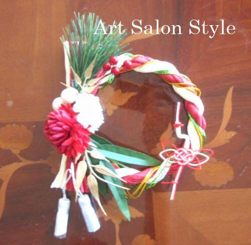 紅白のしめ縄にマム、鶴、松、南天等でアレンジをして、新年を祝うお正月飾りを作りしました。