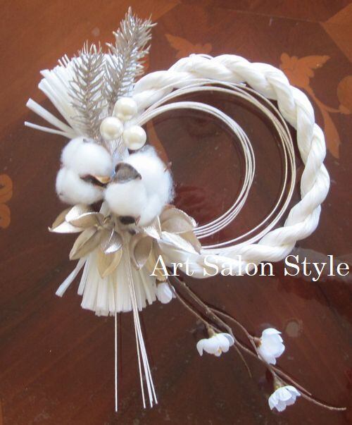 白のしめ縄にコットンの実や梅等でアレンジをして、新年を祝うお正月飾りを作りしました。