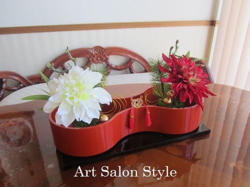 アーティフィシャルフラワーの大輪の紅白ダリアで個性的なお正月飾りを作りしました。
