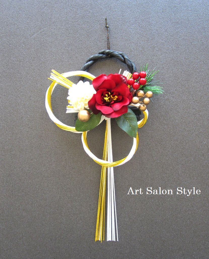 赤色の椿(アーティフィシャルフラワー)とブラックのしめ縄と金白の水引飾りなどで作ったシンプルな小さめのしめ飾りです。