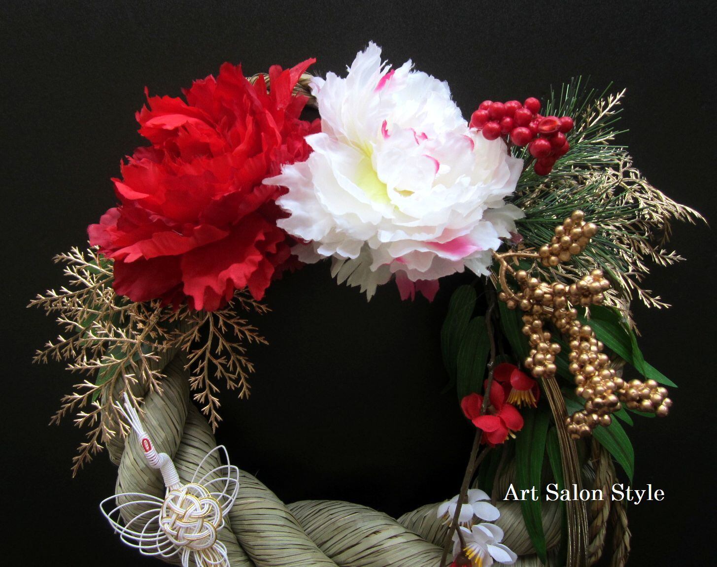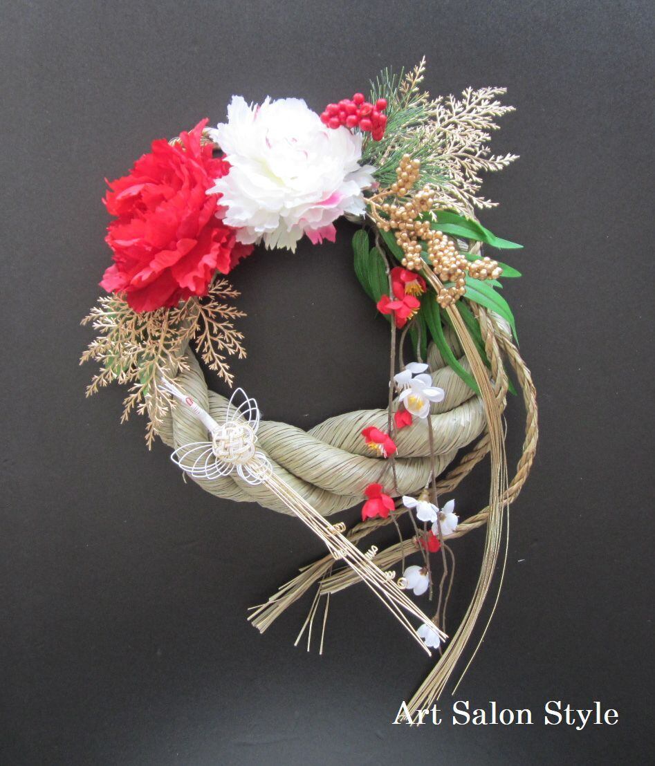 ぷっくりとした大きなしめ縄に、紅白ピオニー、水引、鶴、竹、松、笹、梅で大きなしめ飾りを作製しました。