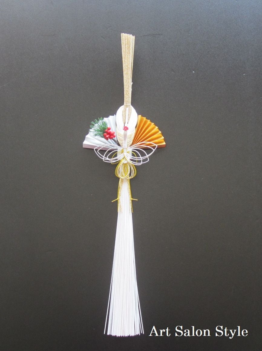 白金の水引に扇、松、南天、鶴を飾り付け、新年を祝うシンプルなお正月飾りを作りしました。