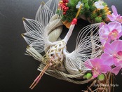 ぷっくりとした大きなしめ縄に、赤紫系の胡蝶蘭、松、水引翔鶴、白梅、ゴールドの笹の葉と水引で大きなしめ飾りを作製しました。