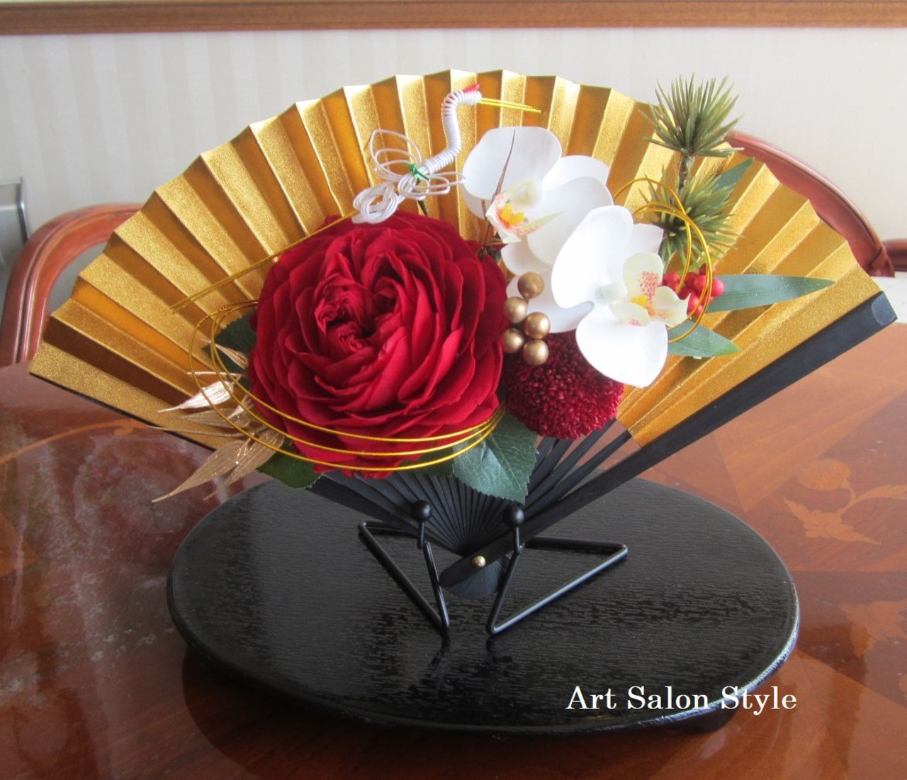 扇に、プリザーブドフラワーの大輪てまりローズとマム、アーティフィシャルフラワーの胡蝶蘭2輪、笹の葉、南天、ゴールドリーフ、そして水引の鶴をポイントにした、豪華なお正月飾りです。