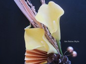 アーティフィシャルフラワーのカラー、ドライのゴールドペイント稲穂、松かさ、梅結びの和紐、扇、水引、ピックなどで新年を飾るしめ縄飾りをお作りしました。