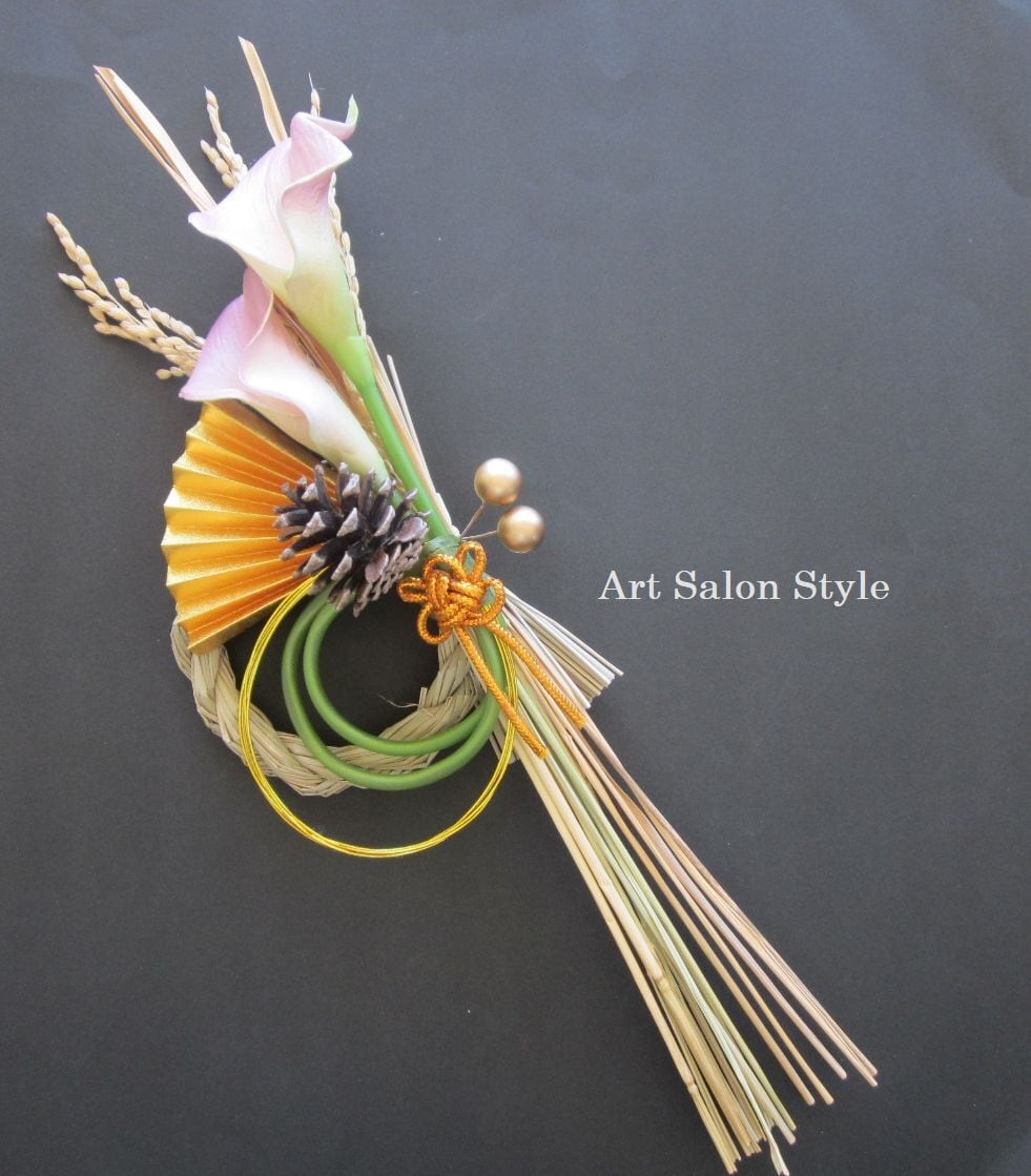 アーティフィシャルフラワーのカラー、ドライのゴールドペイント稲穂、松かさ、梅結びの和紐、扇、水引、ピックなどで新年を飾るしめ縄飾りをお作りしました。