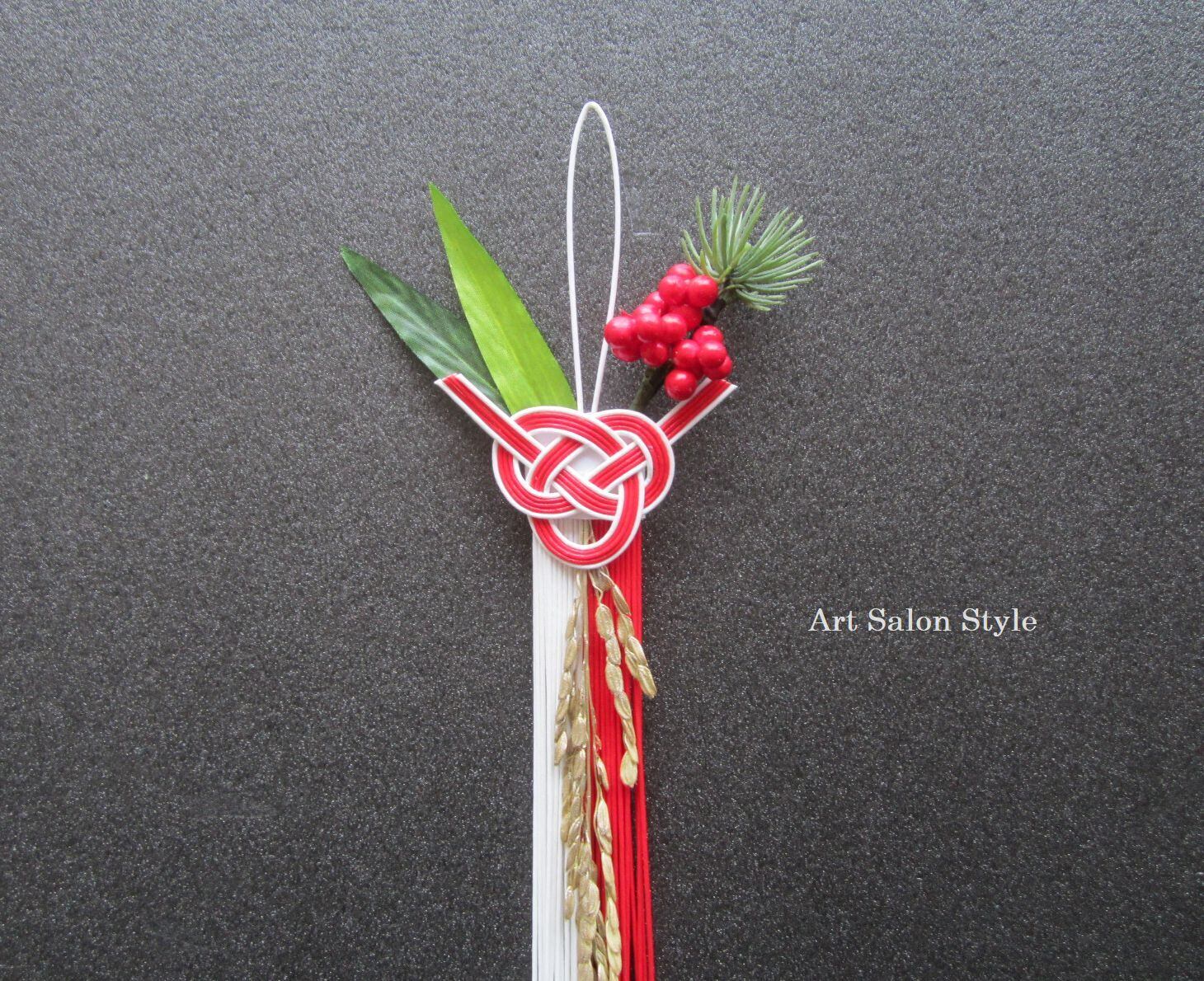 紅白水引に、アーティフィシャルフラワーの松と南天、笹、ドライの稲穂、あわじ結びの水引で、シンプルなお正月飾りを作りました。